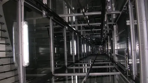 Incastellatura per interno in acciaio inox panoramica con rivestimento interno tramite pannelli in alluminio decorati con fantasie di colori. Impianto oleodinamico con cabina in acciaio inox doppio ingresso opposti, rivestita esternamente con pannelli in planam, parete panoramica con pulsantiera a colonna a tutta altezza.